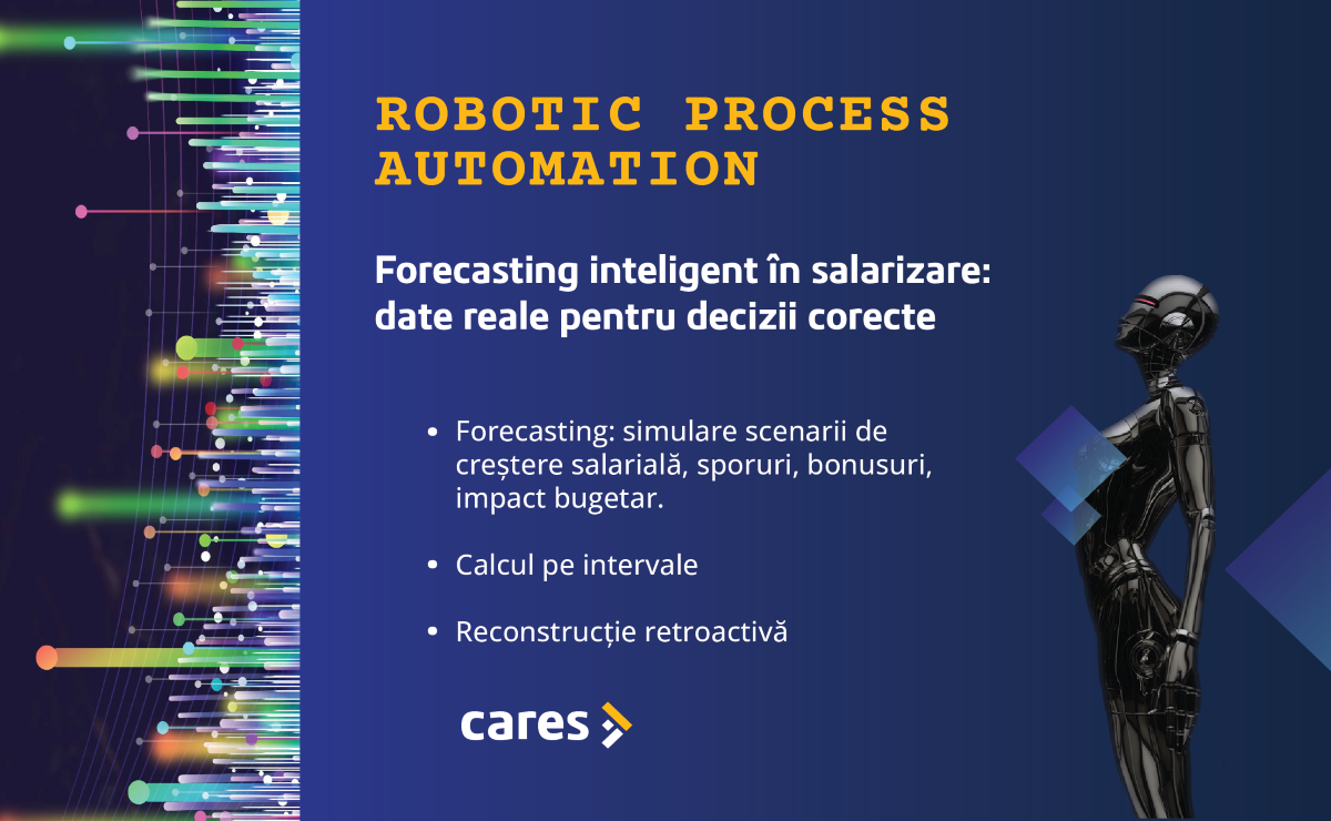 Software-ul de resurse umane si salarizare CARES are în componență un modul de forecasting avansat, bazat pe un robot programabil (RPA). Robotul poate defini mai multe modele de calcul salarial, permițând intervale și schimbări de parametri în timp real cu impact în viitor. De asemenea, pot fi refăcute calcule anterioare cu parametri din trecut sau reconstituiri ale calculelor salariale (schimbare impozit la concedii, reținere la sursă și altele).